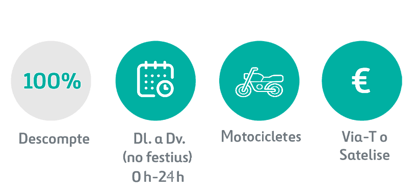 En els viatges d’anada i tornada que es facin en un interval de 24 hores a la mateixa barrera de peatge, de dilluns a divendres no festius, mitjançant registre previ gratuït i utilitzant un sistema de pagament dinàmic (Via-T o Satelise). Els usuaris de motocicletes (Cat. I) podran beneficiar-se del 100% de descompte a partir del 16 de desembre.